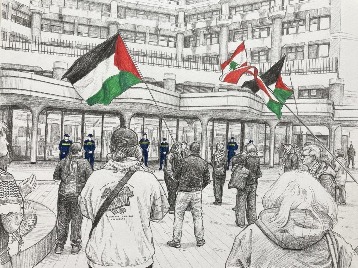 In de ochtend schrijf ik een stukje over een demonstratie in Den Haag die, zoals altijd, zonder duidelijke reden meteen door de politie verplaatst en daarna beëindigd werd. Tijdens de lunch ga ik naar de sit-in bij de ingang van het ministerie van Buitenlandse Zaken, in protest tegen de Nederlandse medeplichtigheid aan oorlogsmisdaden in Gaza en Libanon en voor naleving van het internationaal recht.