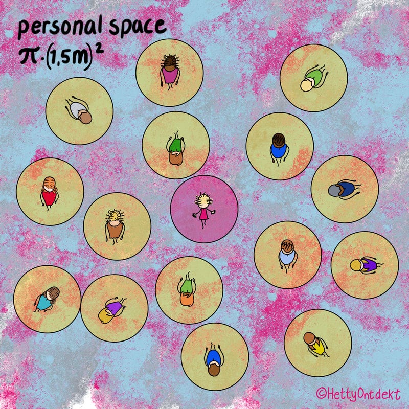 Dat duurde natuurlijk niet lang. Met enige verwondering volgde ik hoe ingewikkeld - en in veel sectoren bovendien onrendabel - die anderhalve meter in de praktijk eigenlijk bleek te zijn. En hoeveel weerstand het opwekte. Ik ging me afvragen hoeveel ruimte er eigenlijk per mens beschikbaar is in de samenleving.