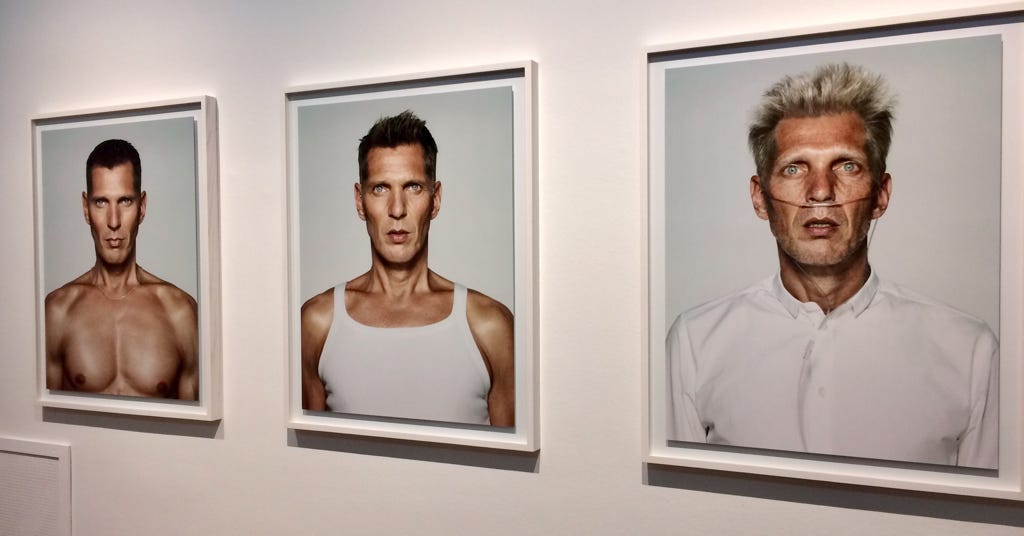 Bij het maken van de tekening van vandaag, liet ik mij inspireren door onderstaand kunstwerk van Erwin Olaf, getiteld “Self-portrait 50 years: I wish, I am, I will be, 2009”. Een dubbeltentoonstelling van zijn werk is momenteel te zien in het Gemeentemuseum en het Fotomuseum in Den Haag.