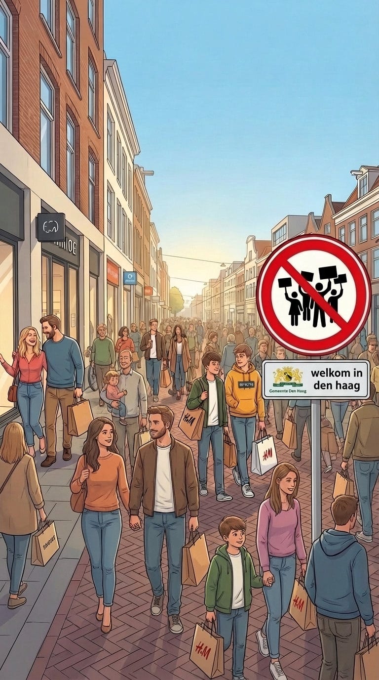Wat Van Zanen doet is het omgekeerde. Niet de kennisgeving is leidend, maar de beperkingen uit zijn eigen beleid. De advocaat van de PvdD zei het treffend: 'Ongestoord winkelen is geen grondrecht, het demonstratierecht wel.' Bij Van Zanen lijkt het omgekeerde het geval.