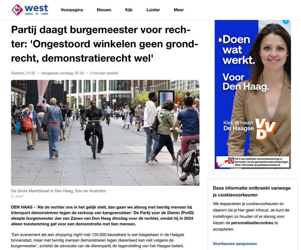 Gisteren was ik bij de rechtbank in Den Haag. De Partij voor de Dieren sleepte burgemeester Van Zanen voor de rechter, omdat hij in 2024 een demonstratie tegen de verkoop van kangoeroeleer beperkte van twintig naar tien deelnemers. Reden: de locatie lag in het zogenoemde 'kernwinkelgebied'.