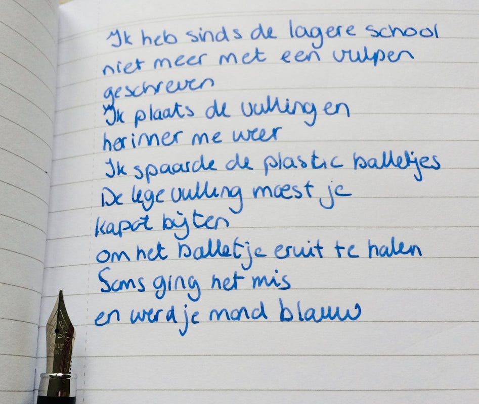"Echte schrijvers schrijven met een vulpen", zei boekenvroedvrouw Yoeke Nagel tegen me op de boekpresentatie van mijn dichtbundel. En ze gaf me er een.