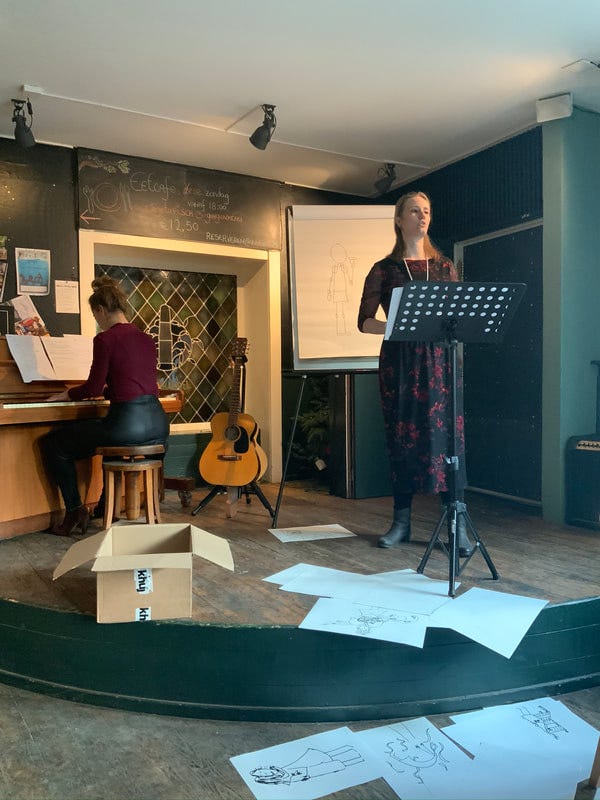 Die beide kanten zie je terug in de gedichten en tekeningen die ik maakte over mijn rouwproces en die ik publiceerde in mijn dichtbundel. En ook in de voorstelling die ik een jaar geleden maakte voor de boekpresentatie, samen met zangeres en theatermaker Nele Mennes; een lichte voorstelling met gedichten, tekeningen, liedjes, verhalen en muziek.
