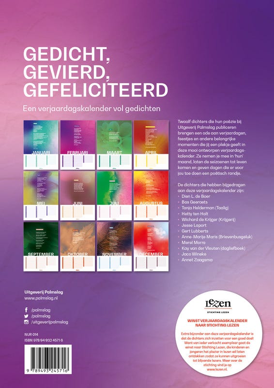 Samen met 11 andere Palmslag-dichters mocht ik een gedicht schrijven voor de gloednieuwe verjaardagskalender Gedicht, Gevierd, Gefeliciteerd.
