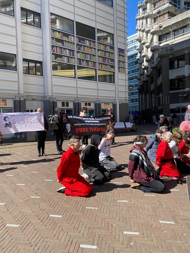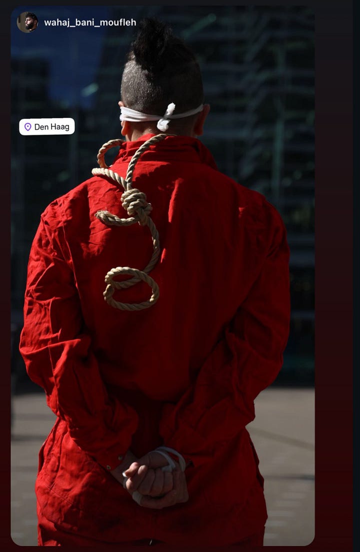 Tien demonstranten op hun knieën voor de publieksingang van de Tweede Kamer. Handen vastgebonden op hun rug. Een strop rond hun nek. Een stille performance om de Nederlandse regering op te roepen zich uit te spreken tegen de Israëlische doodstrafwet.