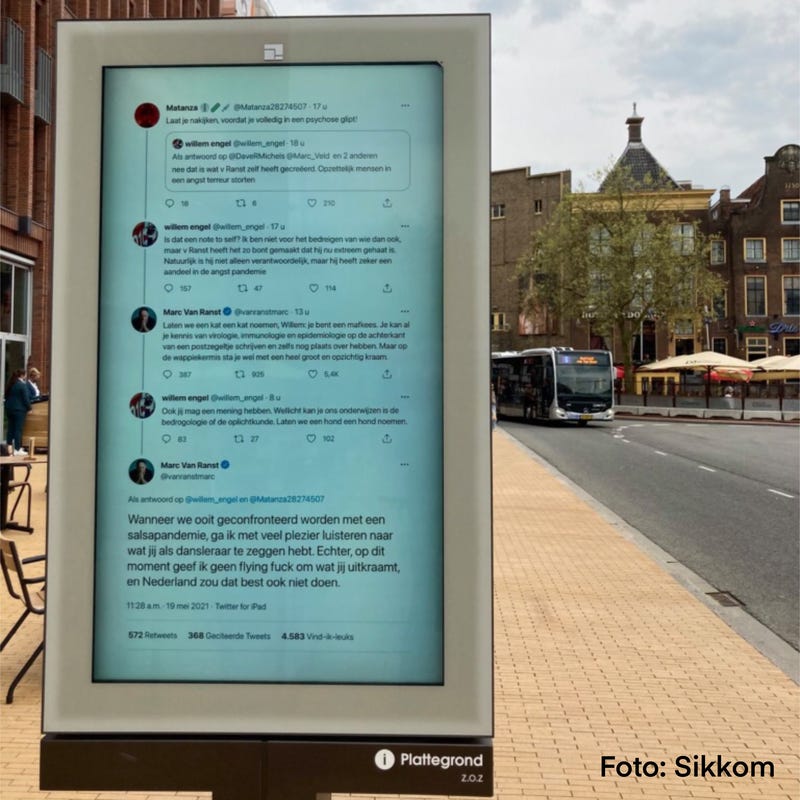 SalsapandemieHetty ten Holtmei 27, 20211DelenPlayPauseBelgische viroloog Van Ranst en dansleraar en viruswaanzinnige Willem Engel hadden een mooie discussie op twitter. Alexander Klöpping zette dit draadje op abri's, onder meer op de Grote Markt in Groningen.