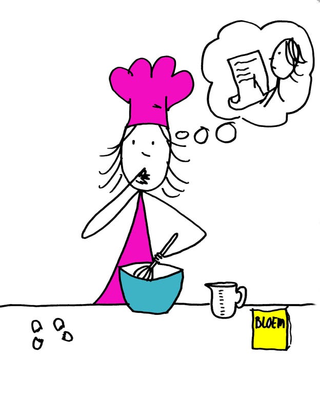 Ik vind dat dus het moeilijkste onderdeel van het hele boek, ondanks de geweldige inspiratie die ik al kreeg van woord- (en beeld)kunstenaar Esther. En dus heb ik inmiddels al twee tekeningen gemaakt, de was opgevouwen, de heg gesnoeid en een bananenbrood gebakken. Alleen schoonmaken lijkt vooralsnog een brug te ver. Maar wie weet.