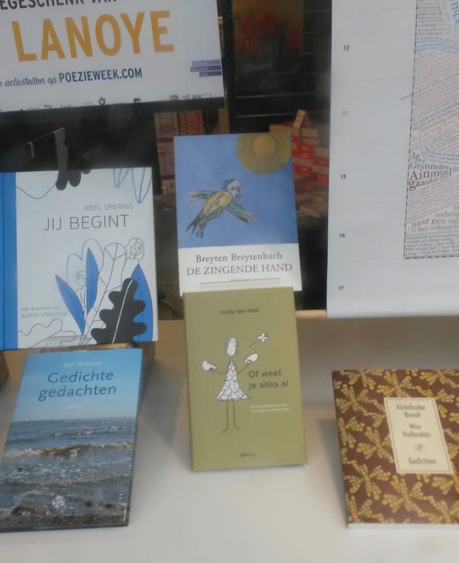 (Boomker Boeken in Haren) is gegaan, die vervolgens een aantal exemplaren heeft ingekocht. Tijdens de Poëziekweek, begin februari, kreeg het daar zelfs een prominente plek in de etalage.