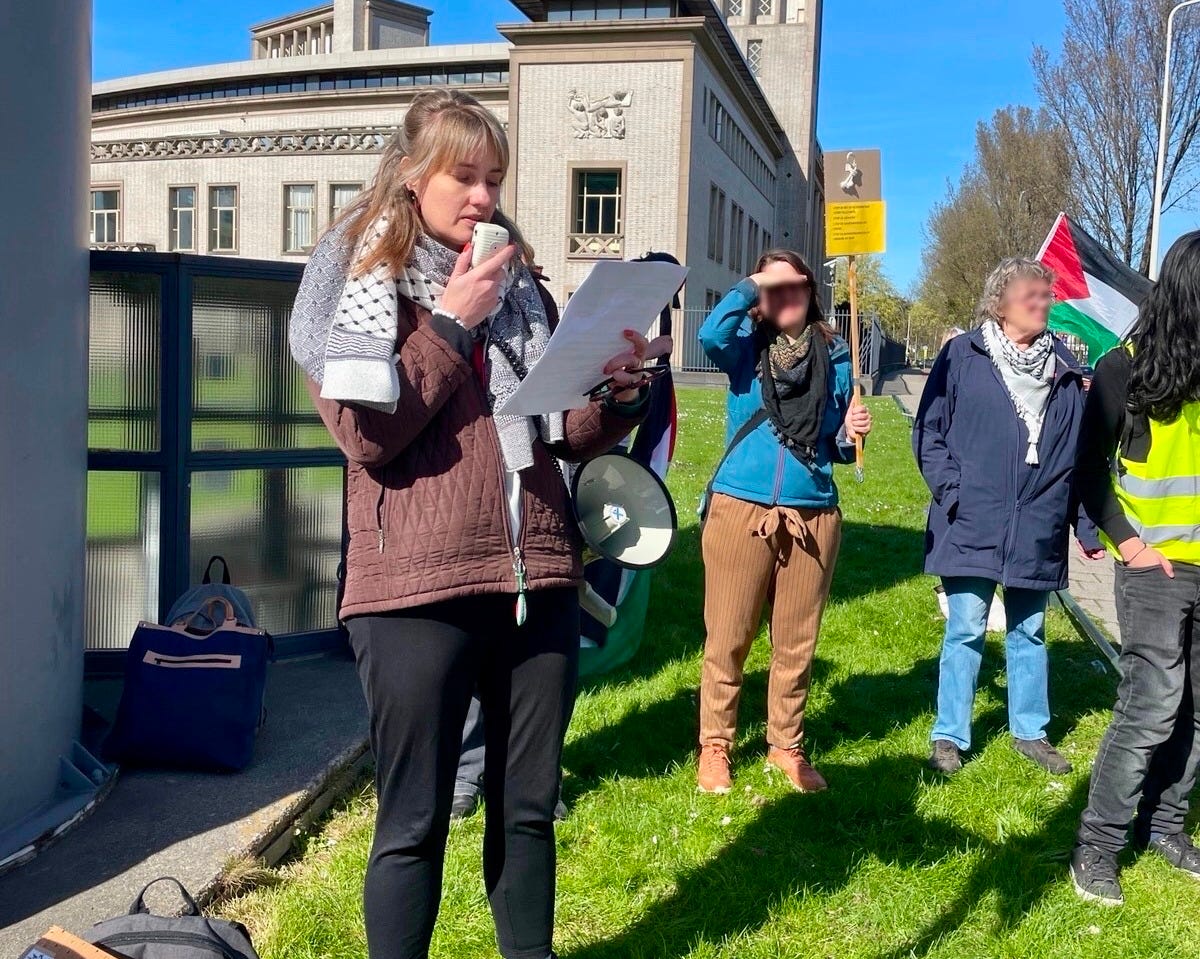 Gister deed ik mee aan een demonstratie tegenover de Israëlische ambassade in Den Haag. Ik wilde op deze plek, voor de Israëlische ambassade, een gedicht voordragen van de Palestijnse dichter Rafeef Ziadah. Om 14 uur verzamelden enkele tientallen demonstranten tegenover de ambassade.