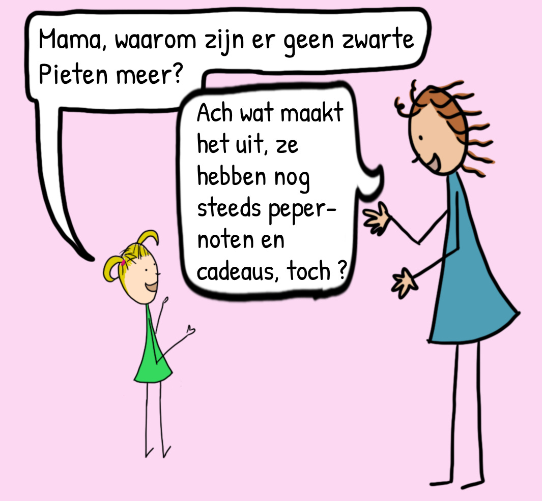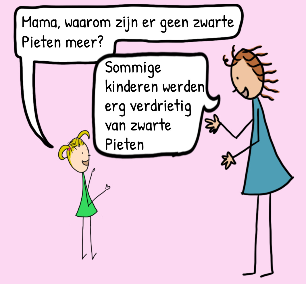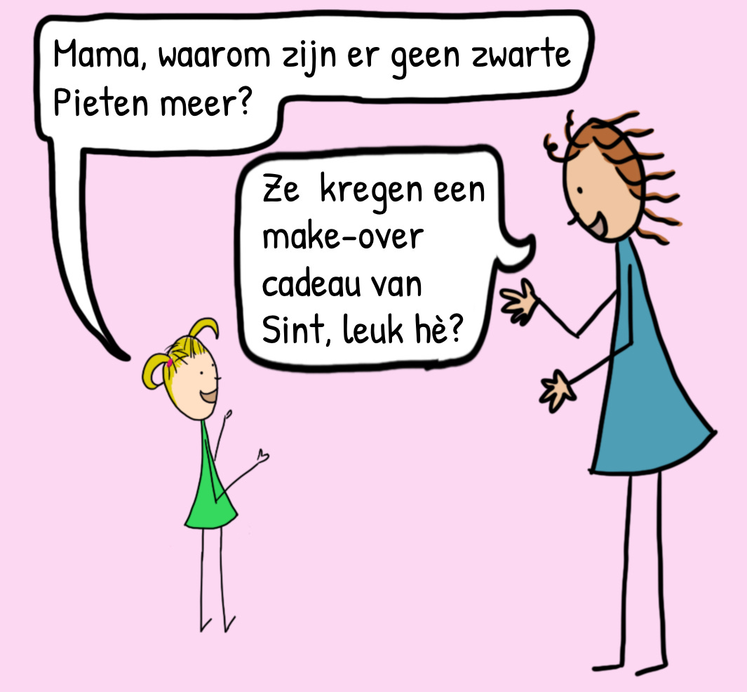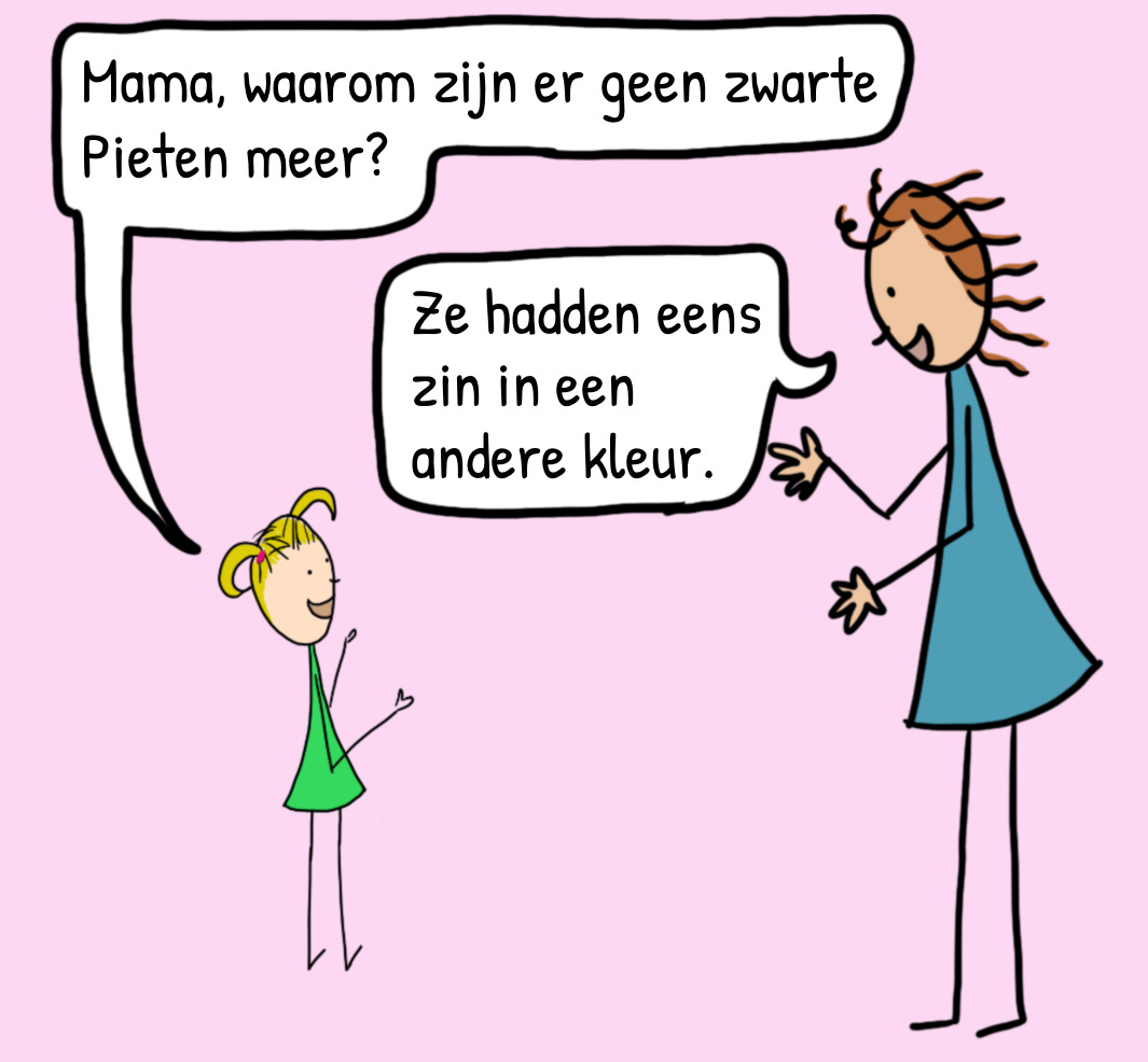 Door de afwezigheid van Sinterklaasintochten vanwege corona, was de Zwarte Pieten discussie dit jaar in mijn beleving wat minder prominent dan voorgaande jaren. Toch waren er online allerlei alternatieve Sinterklaasjouraals mét Zwarte Piet. Sommige mensen gebruiken het argument dat het voor kinderen verwarrend zou zijn dat Piet er anders uitziet, of dat ze het niet aan hun kinderen kunnen uitleggen. Daar besloot ik ze maar eens een handje bij te helpen.