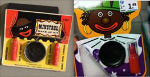 Foto: Links een Amerikaans blackface schminksetje in een museum in de VS. Rechts een Nederlands Zwarte Piet schminksetje, twee jaar geleden bij Albert Heijn.
